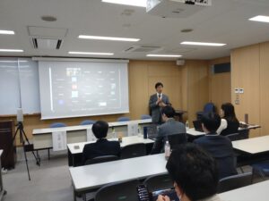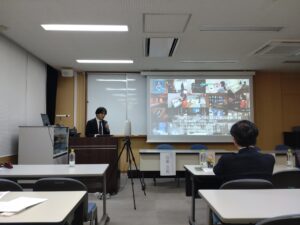 講演1では、講座メンバーより現在推進している主要なプロジェクトについて、報告を行いました。本講座特定准教授・講座主任 高木からは、講座設立の背景や取り組みの全体像の紹介、特定助教 石村からは社会的インパクト評価の普及・実装に関して、ガイドライン作成やPFSを活用した事業の伴走支援について、特定助教 川内からはこれまで効果の見える化が十分に行われてこなかった活動の評価について、今後展開していく活動の例も含めながら紹介しました。