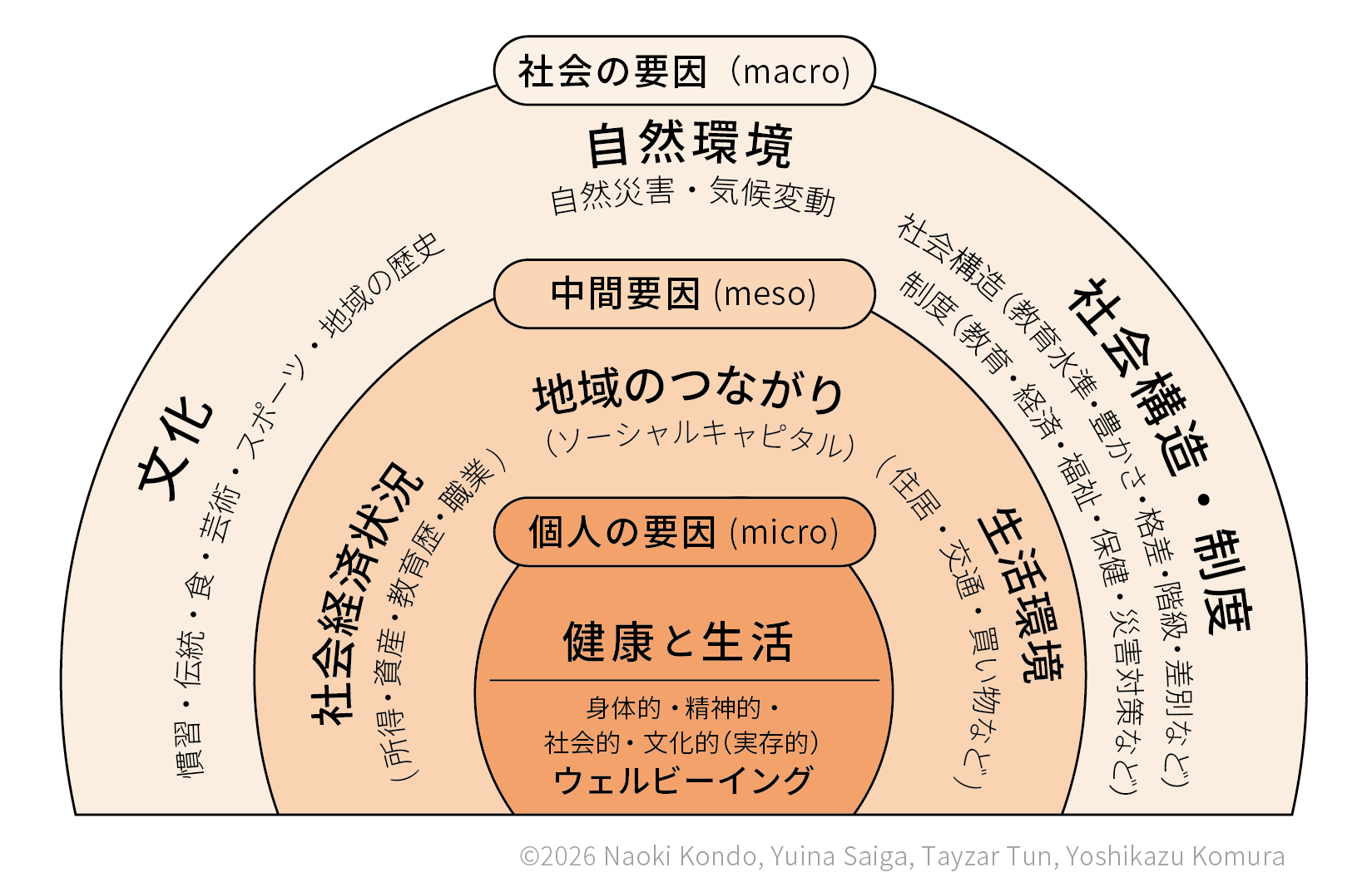 「衣食足りて礼節を知る」は、主任教授の近藤が大切にしている言葉です。人々の健康は、学歴や所得、職業、人とのつながりといった社会的な状況の影響を受けます。また、国や地域の政策や文化、景気動向や所得格差といった社会環境の影響も受けます。日々空腹にあえいでいては、周囲の人々とともに、自分らしく生きることは難しいでしょう。誰の助けも得られず孤独に生活していてもやはり難しいでしょう。